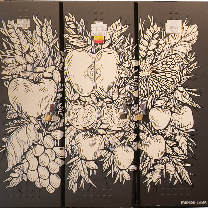 The Medley is a hand painted mural by Melbourne artist, Manda Lane, featuring a playful bouquet of fruit, vegetables and grains inspired by the stalls at South Melbourne Market.