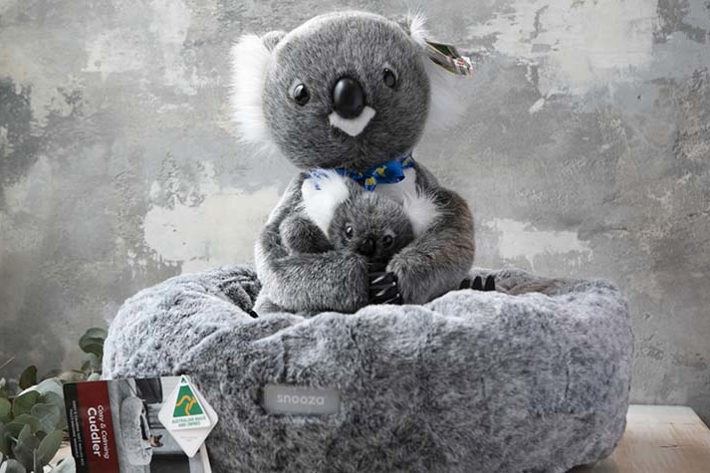 Koala from Clare's Bears and Wares sitting on a Snooza Pet Bed from South Melbourne Market Pet Shop