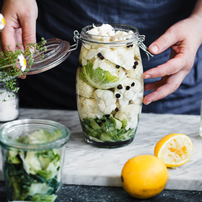 If you have vegetables on the brink of extinction turn them into pickles! In a large, sterilized jar layer chopped vegetables (you can use onion, cucumber, radishes, carrots, chilies or cauliflower) with aromatics (try a combination of peppercorns, fennel seeds, mustard seeds, juniper berries, cumin or dill seeds) and flavour with herbs and the zest of citrus. Create a pickling liquid with 2 cups of white vinegar, 2 cups of water, 2 tablespoons of salt and 4 tablespoons of white sugar by heating it up in a pot on the stove. Carefully pour the hot liquid into the jar and allow to cool before transferring to the fridge. The flavour will develop overnight and your pickles will last for up to two weeks in the fridge!