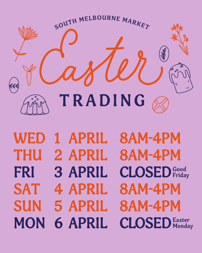 The Market will be open on Thursday 2 April to give you time to load up on your Easter goodies. Please note the Market will be closed on Good Friday (3 April) for the Public Holiday.