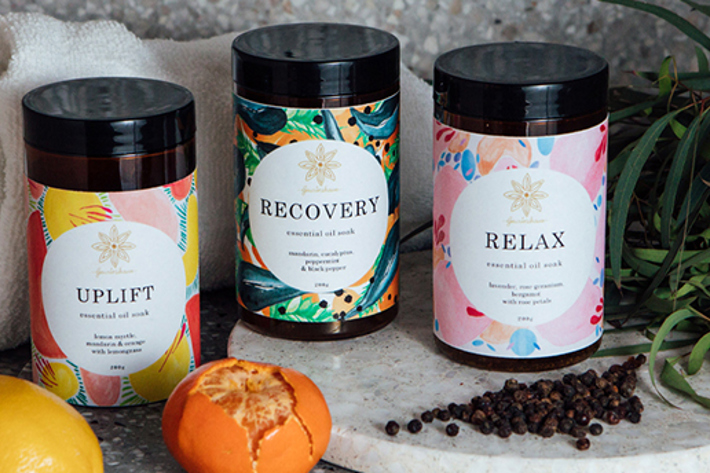 Olieve products made from olive oil, which provide anti-aging benefits and help restore skin smoothness. Salt or Coffee scrub $20, Wash and Cream Twin Set $39, Soy and Olive Oil Candle $39, Wild Lemon Myrtle Hand & Body Cream $29.