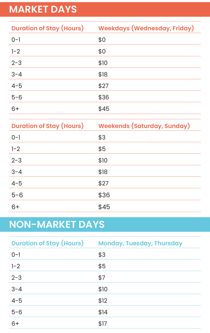 - If the Market is open for an extra trading day (i.e. Monday, Tuesday, Thursday), the weekday Market carpark rates will apply.