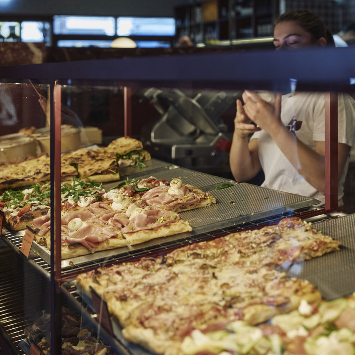 Split between a morning coffee, lunch, dinner and takeaway offering, Pizzateca Lupa’s menu is a considered exploration of authentic Italian cuisine. For takeaway lunch, the pizza shop offers pizza in teglia (square focaccia, cooked in a tray and served by the slice), with a handful of different toppings on rotation. Pizzateca Lupa’s classic pizza tonda can also be made fresh to order for takeaway.