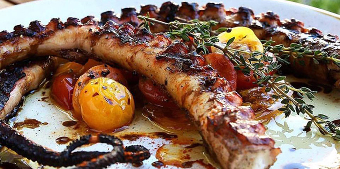 To serve, grill the octopus until golden brown. Place on a plate and drizzle with olive oil, balsamic cream and top with cherry tomatoes.
