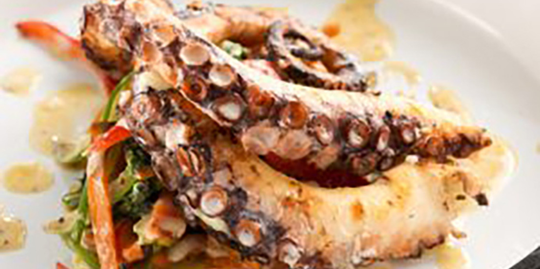 Brush the octopus legs lightly with olive oil, then place on a hot grill and cook each side for about 3-4 minutes. Place the octopus on a long plate then sprinkle on some olive oil, salt, pepper, and fresh thyme leaves. Finally, drizzle over the raspberry-balsamic cream.