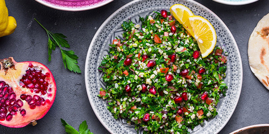 Tabouleh is one of Lebanon’s national dishes and for very good reasons - it is delicious! Its balanced flavours of fresh herbs delicately sliced make it light and fluffy, complemented with diced fresh seasonal tomatoes and spring onions, the crunch of burghul and a lovely tangy dressing. This salad is ideal for barbecues.